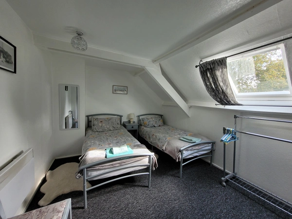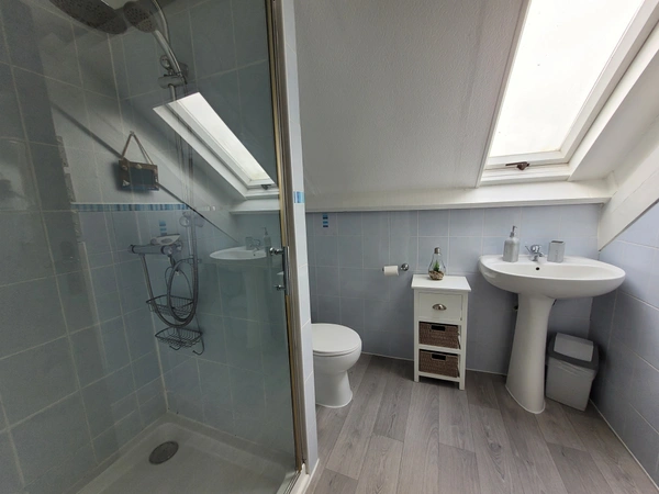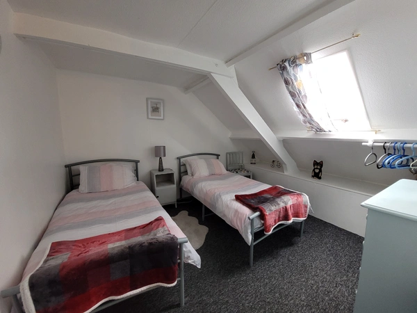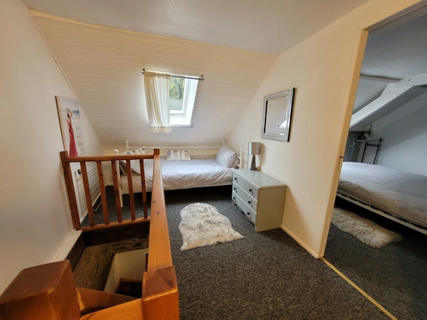Rez-de-chaussée : Un séjour/salle à manger avec coin cuisine. Étage : Deux chambres et une salle de bains avec cabine de douche et WC.