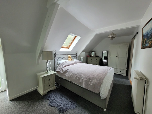 Rez-de-chaussée : Une cuisine aménagée avec cheminée et insert, un salon cosy avec cheminée. Étage : Deux chambres, dont une avec salle de bains, une salle d'eau et un WC séparé.
